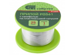Припой с канифолью, D 1 мм, 25 г, POS61, на пластмассовой катушке Сибртех СИБРТЕХ 913362
