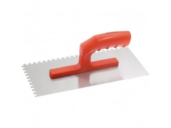 2. Гладилка штукатурная зубчатая. Инструмент по своим характеристикам полностью аналогичный предыдущему типу, за исключением наличия зубьев на рабочей части. Этот тип гладилок широко используют при работе с керамической плиткой, керамогранитом, гранитными плитами и другими подобными материалами. Наличие зубьев помогает эффективней распределить строительную смесь, что обеспечит лучшую адгезию материалов.