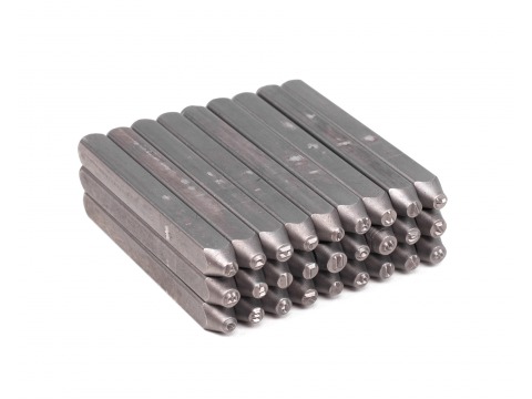 Набор состоит из 27 клейм с буквами алфавита от А до Z (латиница) и знака &. ГОСТ 25726-83 (аналог). Клейма изготовлены из инструментальной стали 45 и упакованы в пластиковую коробку. Высота шрифта 3 мм. Толщина державки 6 мм. Длина державки 60 мм.