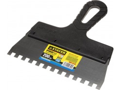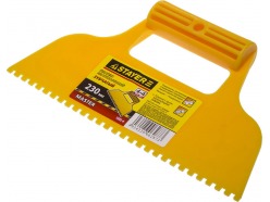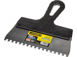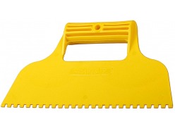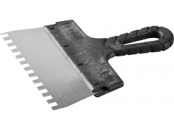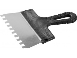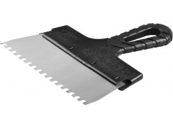 - Гребенчатый — зубцы, расположенные по лезвию, способствуют равномерному нанесению строительных смесей. Используется для нанесения клеевого состава при укладке плитки, работы с декоративной штукатуркой, удаления обоев.