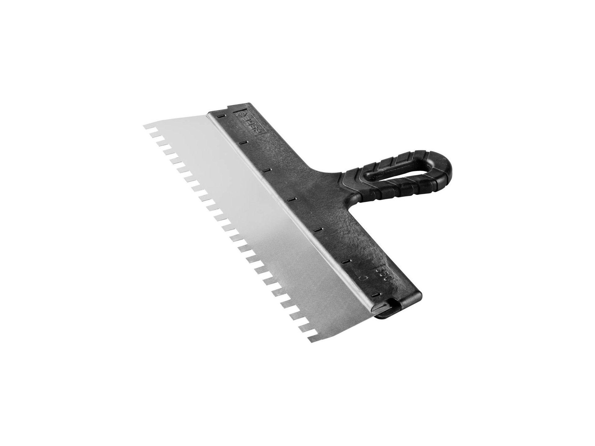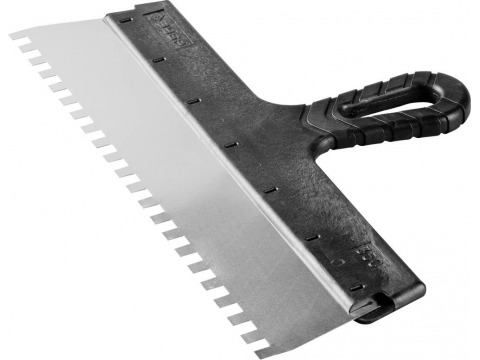 Благодаря зубчатой кромке шпатель идеально подходит для работы со строительными и клеевыми смесями, полотно из нержавеющей стали обеспечивает надежность и долгий срок службы инструмента, а удобная пластмассовая рукоятка создает условия для комфортной работы